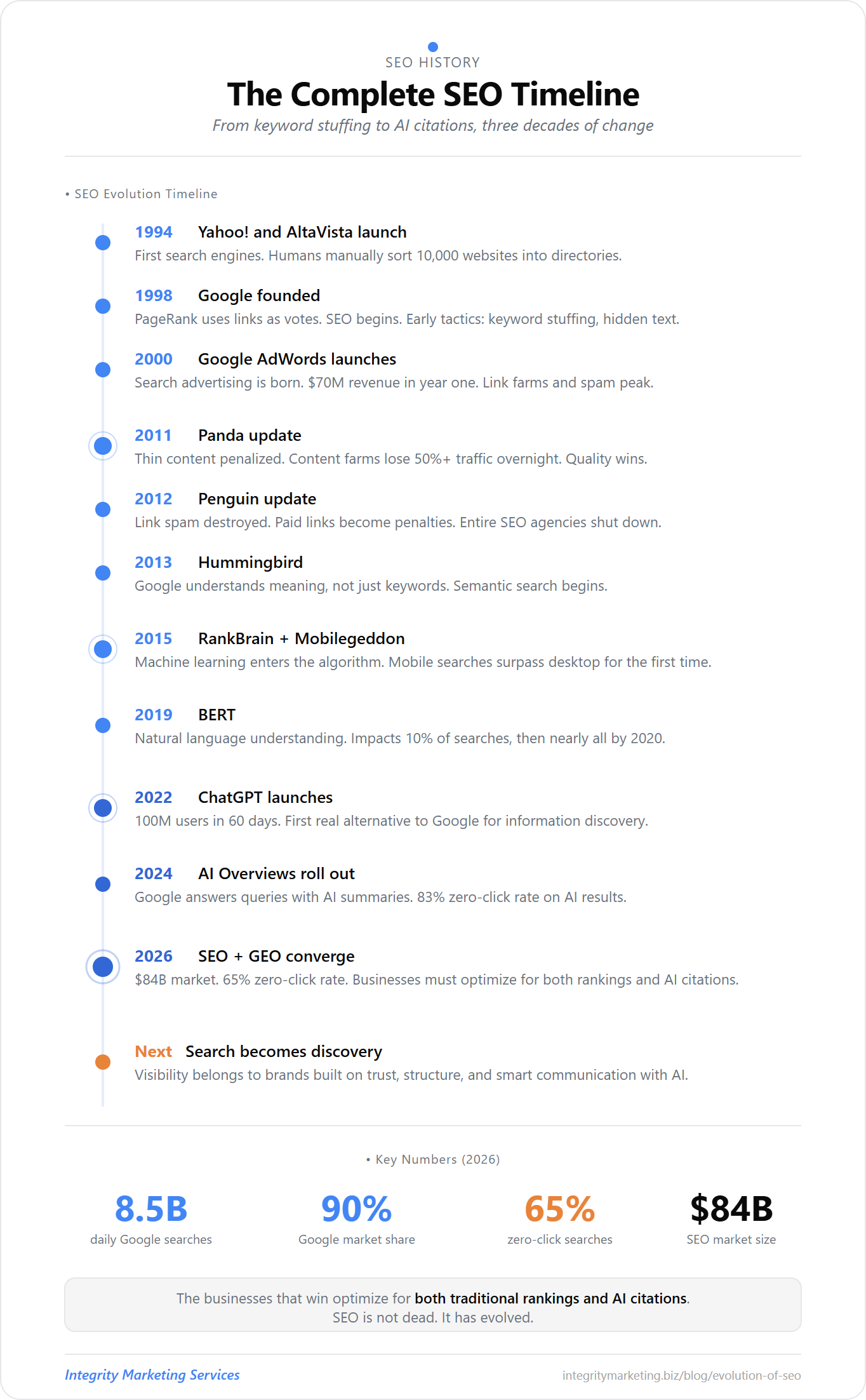 This is the story of how search went from those early keyword-matching experiments to AI systems that read the entire internet and answer your question before you finish typing it. It covers three decades of algorithm updates, billion-dollar shifts in strategy, and an industry that has had to reinvent itself at every turn. If you run a business that depends on being found online, understanding this history is not optional. It is the foundation for every smart decision you will make about SEO going forward.